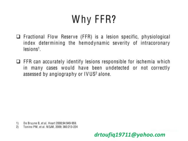 Fractional flow reserve (ffr) is emerging as a useful clinical tool for assessing the functional significance of coronary atherosclerosis. In defer trial, 325 patients who were planned to undergo pci underwent ffr measurement. Pijls and de bruyne, coronary pressure kluweracademic publishers, 2000.